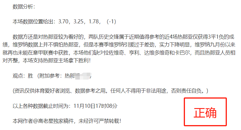 (温馨提示:观点回顾为已完场赛事的统计,并不能代表未来的观点预测结果走势,观点仅为其个人意见,与平.台无关。资讯仅供体育爱好者浏览,并不构成购.彩建议,任何人不得用于非法用途,请广大用户理性消费。)