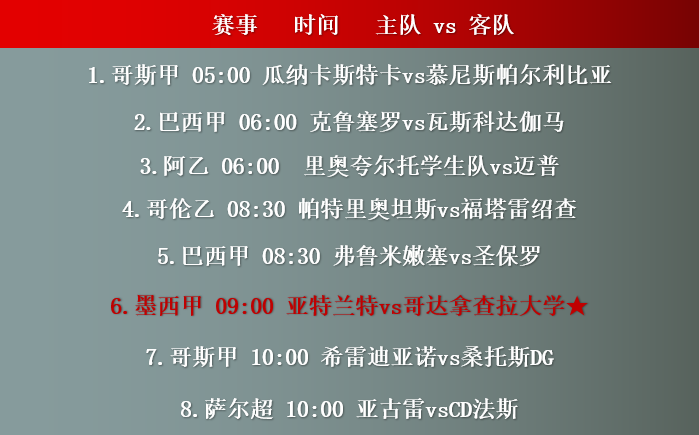 赛事前瞻:本文提供11月23日05时00分-10时00分时段的8场足球赛事走势分析表,当中包括哥斯甲、巴西甲、阿乙、墨西甲等赛事提供分析参考,具备较高的参考价值。主要关注赛程如下: