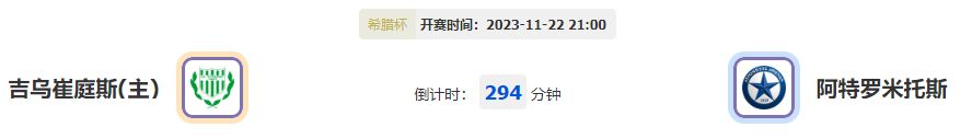 北京时间11月22日21:00,希腊杯第5轮,吉乌崔庭斯vs阿特罗米托斯。吉乌崔庭斯联赛不失升级压力,如今在上游保持稳定,他们能否在此役作出抗衡?阿特罗米托斯表现平庸如今为保级而战,稳定的抢分状态还在继续,此役作战谁是更有作为的一方?