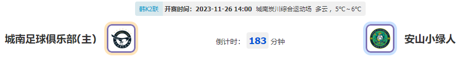 北京时间2023年11月26日14:00,此役是城南足球俱乐部与安山小绿人今年的第三场对决,城南足球俱乐部如今在主场还有优势,此役能否拿下胜绩捍卫主场?而安山小绿人还是此前低迷的状态,此番客访定然不失抢分战意,他们又能否做到反客为主?