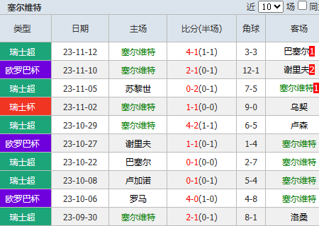 2、在上轮比赛主场4-1击败巴塞尔后,塞尔维特取得联赛6连胜。
