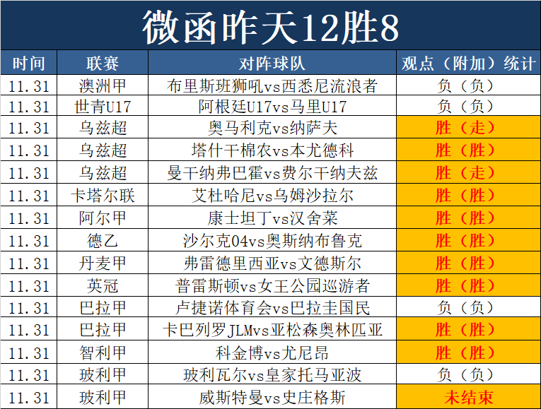 1、昨天狂胜了,取下12胜8的成绩,有2场打平,昨天14场比赛只有4场失手,现在还有1场比赛未结束,目前目前处于领先的状态,今天周六继续冲。