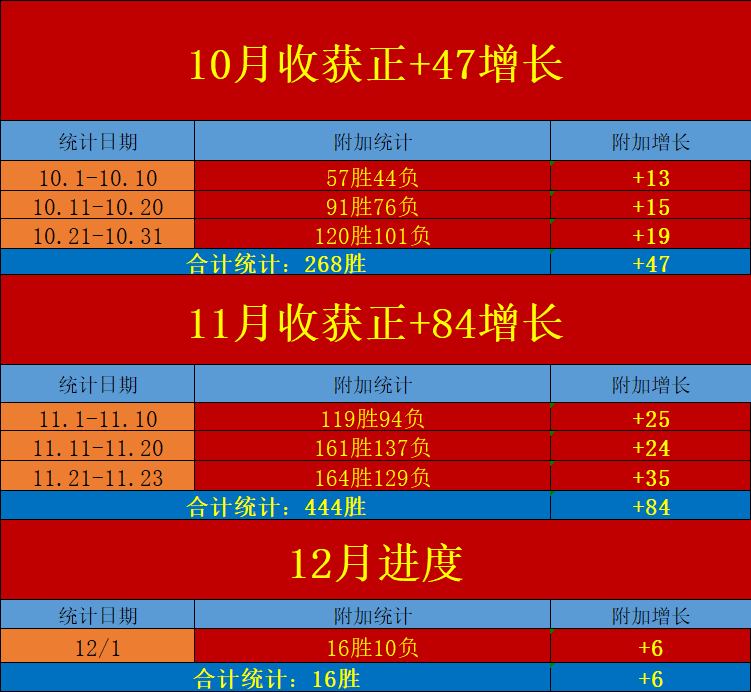延续11月的完美收官表现,12月起步继续交出精彩数据发挥,拿下16场胜利观点分享起步,单日收获净+6的优质向上增长能力!在过去的10-11月进程里,新版模块合计取得净+131场的优秀数据收获!新版模块在保持高产的动作下维持着稳定的正向增长能力,炸裂发挥值得保持持续追踪关注!