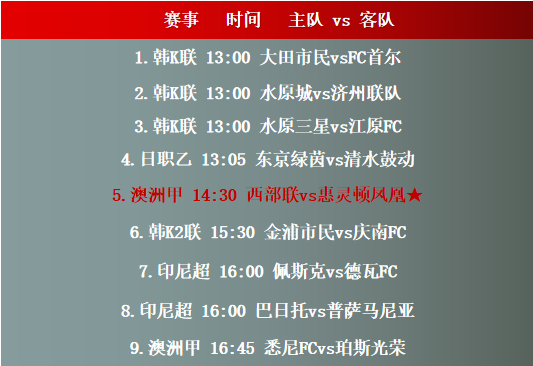 赛事前瞻:本文提供12月02日13时00分-16时45分时段的9场足球赛事走势分析表,当中包括韩K联、日职乙、澳洲甲、印尼超等赛事提供分析参考,具备较高的参考价值。主要关注赛程如下: