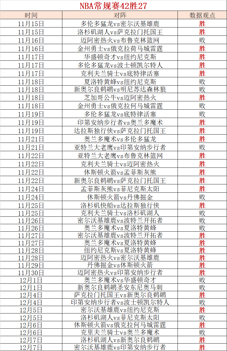 NBA赛事成绩42胜27,胜率保持在65%,表现稳定。今天继续征战NBA,希望大家喜欢。