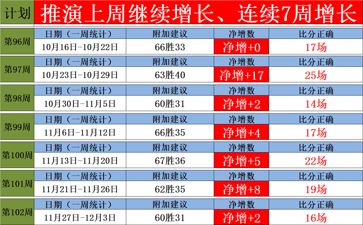 注:观察到了大家选择性的关注,这是不理性,按照推演每周的计划,必定有增长,成绩有目共睹,切记不能因为一天半天小偏差,就放弃了,另外要提醒的是,每场比赛的建议,要均数,不能增数,这样的话,一周下来必定会有增长的,笔者的计划是一周的。