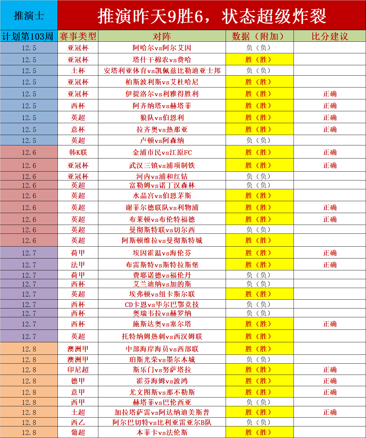 1、推演士计划第103周(走不纳入统计)昨天状态超级炸裂,拿下9胜6的佳绩,连续4天净增长,并且击中了4场比分,四天共继续了15场比分,比分正确率极高,近期的状态炸裂,昨天的五大联赛3胜2,五大联赛已经全面掌握,今天重点五大联赛继续。