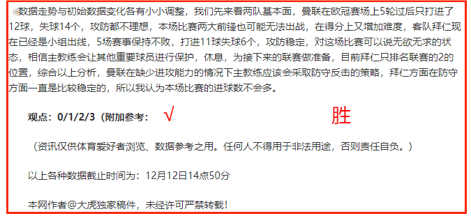 (温馨提示:观点回顾为已完场赛事的统计,并不能代表未来的观点预测结果走势,观点仅为其个人意见,与平.台无关。资讯仅供体育爱好者浏览,并不构成购.彩建议,任何人不得用于非法用途,请广大用户理性消费。)
