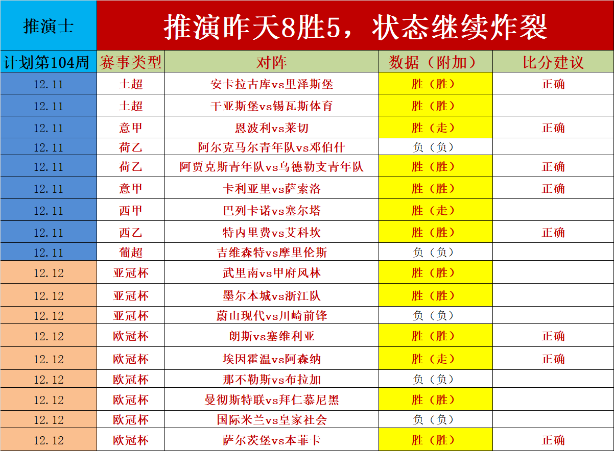1、推演士计划第104(走不纳入统计)昨天周二继续炸裂,昨天拿下8胜5的佳绩,9场比赛仅仅只有3场失手,而且昨天击中了3场比分,昨天的含金量同样十足,今天重点欧冠杯乘胜追击。