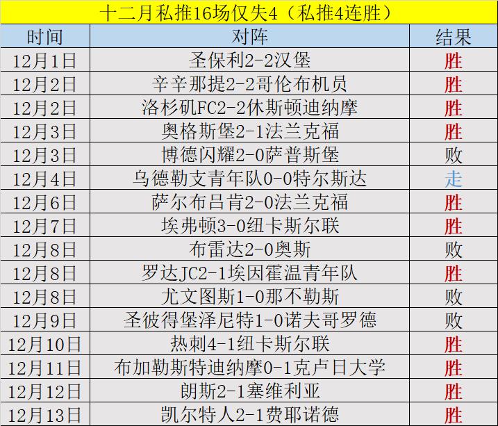 昨天的私推赛事再次胜利,凯尔特人2-1费耶诺德,十二月私推16场仅失4(私推4连胜),状态炸裂。今晚再接再厉,冲击更好成绩。