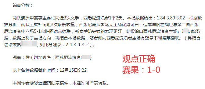 昨日3失1战绩,澳洲甲赛事:西悉尼流浪者主场1-0力克阿德莱德联,观点方向顺利打出;另外意甲赛事:热那亚主场1-1逼平尤文图斯,比分方向完美打出。