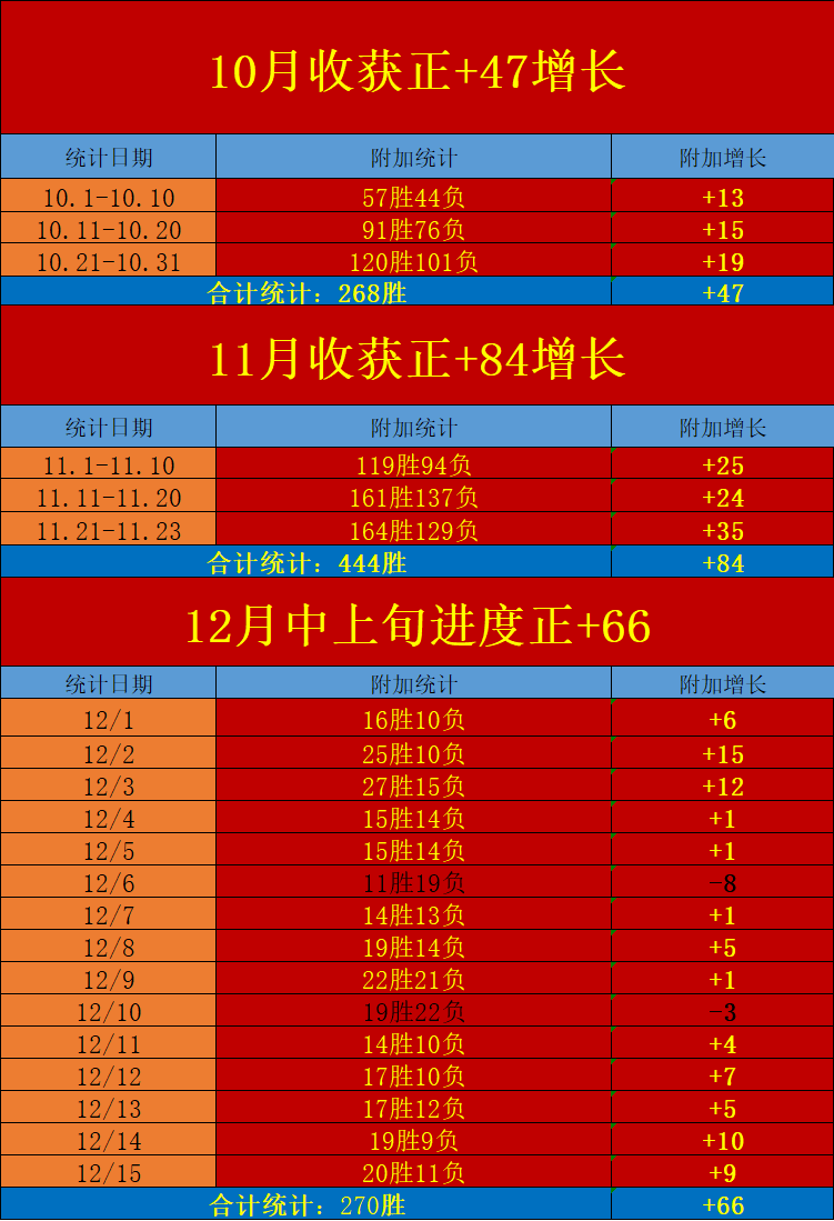 昨天完成赛程继续交出精彩发挥,延续中旬优秀起步,拿下20场胜利观点分享,单日再次狂取净+9的优质数据成绩!中旬计划连胜5天豪取正+35的净增长成绩!12月已完成的15天赛程优秀日高达13天,合计取得270场胜利观点并从中转化出净+66场的向上增长成绩!笔者目标的第8个连胜旬计划奠定了厚实基础,中旬的下半程比赛继续迈向更高峰值出发!