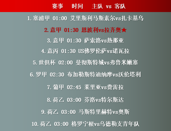 赛事前瞻:本文提供12月23日01时00分-03时00分时段的10场足球赛事走势分析表,当中包括塞浦甲、意甲、葡甲、荷乙等赛事提供分析参考,具备较高的参考价值。主要关注赛程如下: