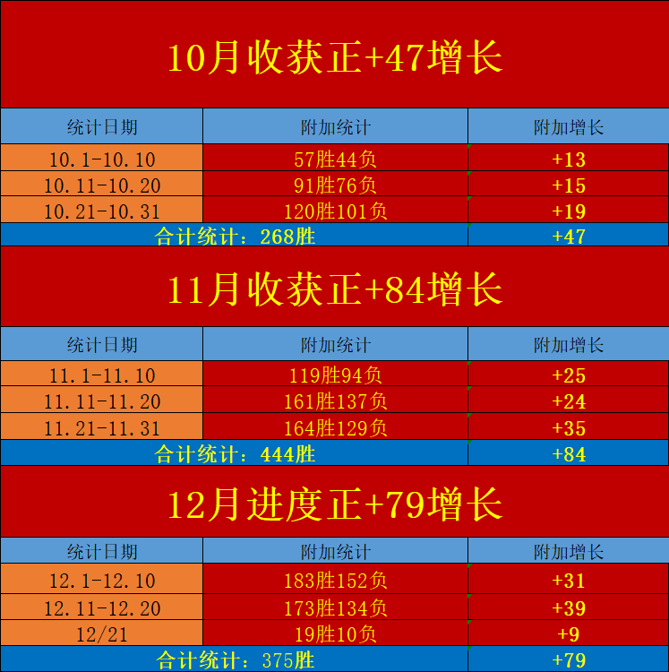 2.延续上中旬的优秀发挥,12月进程合计已经取得了375场胜利场次分享,并从中转化出净+79的优质净增,整体进度远超过去的10-11月优秀进程,进入2023年末冲刺以来数据模块持续展现高度数据亲和力!