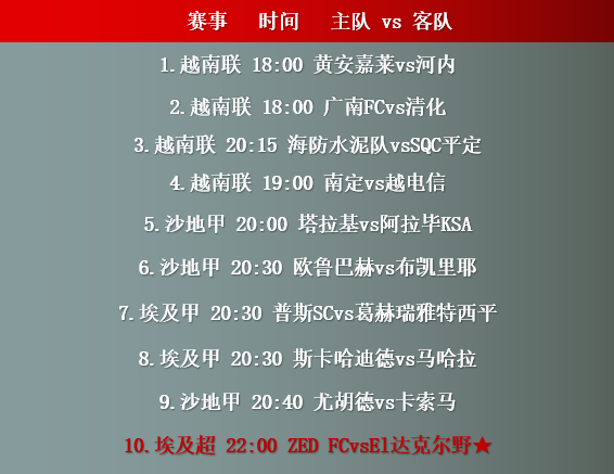 赛事前瞻:本文提供12月27日18时00分-22时00分时段的10场足球赛事走势分析表,当中包括越南联、沙地甲、埃及甲等赛事提供分析参考,具备较高的参考价值。主要关注赛程如下: