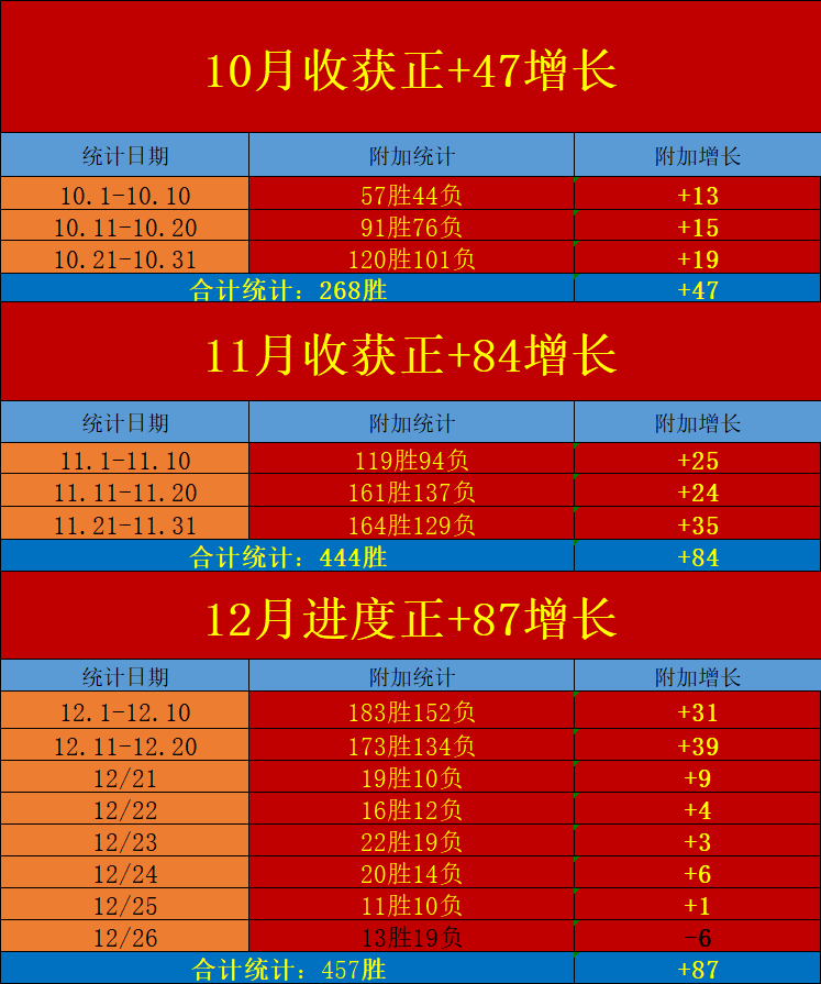 昨天已完成赛事进度拿下13场胜利观点分享,受到多场赛事的冷热数据影响下进度有所减弱,截至到目前为止,12月赛事进度合计取得457场胜利观点的分享,并从中转化出了净+87场的胜利正向增长,在经历了下旬连续5天的增长后处于一个轻微的数据调整区间。本日重新对精选赛程进行筛选,争取完成调整后继续向更高峰值出发!