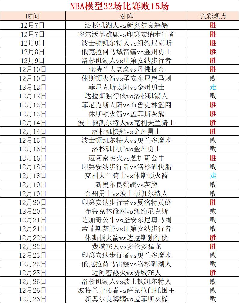 NBA赛事数据32场败15场,今天继续征战NBA,希望大家喜欢。