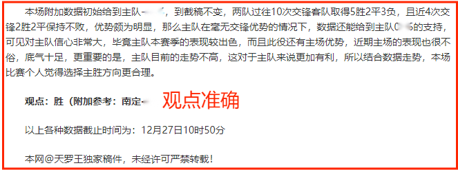 (温馨提示:观点回顾为已完场赛事的统计,并不能代表未来的观点预测结果走势,观点仅为其个人意见,与平.台无关。资讯仅供体育爱好者浏览,并不构成购.彩建议,任何人不得用于非法用途,请广大用户理性消费。)