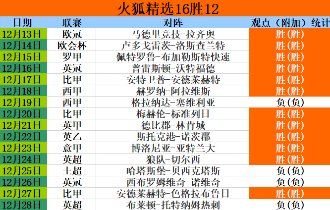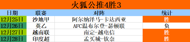 昨天火狐公推送出的印度超赛事,孟买城主场3-0完胜钦奈,比赛顺利打出,公推拿下两连胜,近4胜3。可惜精选方面,托特纳姆热刺客场2-4不敌布莱顿,比赛没能打出,精选近16胜12。元旦将至,祝小伙伴们平安喜乐,万事胜意,愿所有美好,不负归期,愿你喜欢的都拥有!今天别忘了继续关注火狐的动态哦!