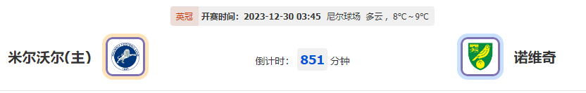 北京时间12月30日03时45分,英冠2023-2024赛季第25轮比赛,米尔沃尔vs诺维奇,主队现时取得多轮不败士气保持上升阶段,本次主场迎战徘徊在中游的诺维奇,能否顺利捍卫主场继续抢分抢胜?让我们拭目以待!