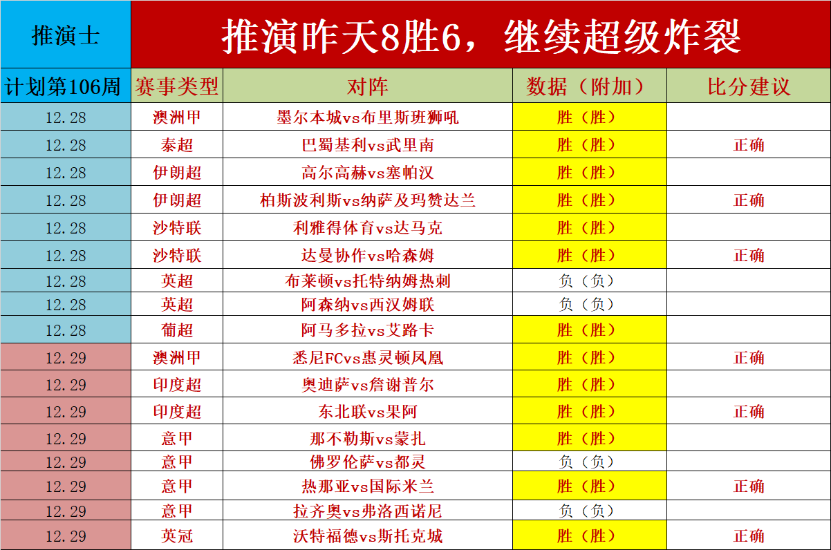 1、推演士计划第106周(走不纳入统计)昨天继续状态超级炸裂,拿下8胜6的佳绩,并且击中了4场比分,这几天胜率极高的同时,比分正确率也高,含金量十足,老铁们也是尝到了不少甜头,重点五大联赛又来了。