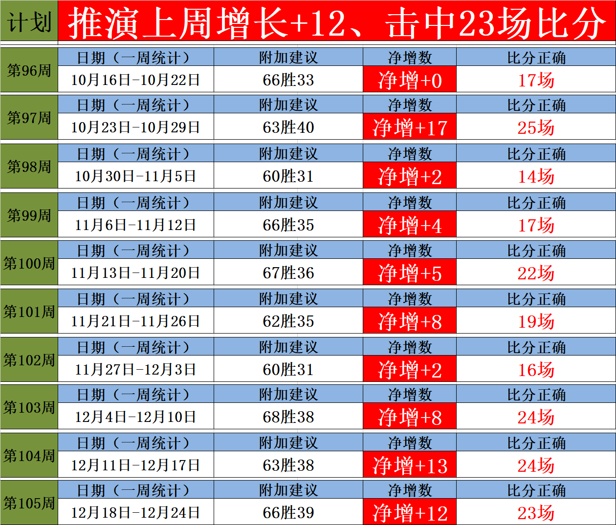 2、上周69胜39,净增长+12,近48有44周保持正向净增长,上周预测23场比分正确,持续的保持了高效的稳定。