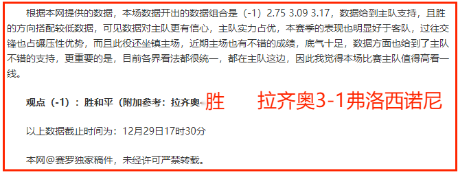 昨天分享的意甲赛事准确打出,近期分享的2场赛事取得2连胜,笔者状态逐渐恢复,今天乘胜追击。