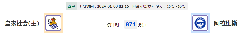 北京时间2024年1月3日02:15,2023-2024 西班牙甲组联赛,皇家社会vs阿拉维斯,此役是西甲赛新赛季第19轮的较量,皇家社会上轮联赛客场0-0战平加的斯,联赛近2轮连平,此役坐镇主场阿诺埃塔球场迎战阿拉维斯,两队如何对峙?下面由本作者为大家做详细阐述。