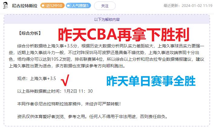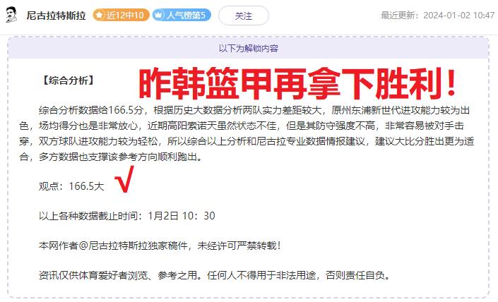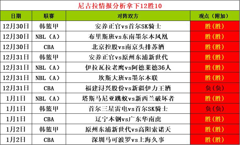 尼古拉拿下12胜10成绩,昨天韩篮甲、CBA拿下胜利,单日全胜!信心情报分析再次来袭,长期解读惊喜不断,精准赛事再出击,3月份尼古拉拿下9连胜辉煌战绩还是历历在目,2月10连胜再次顺利跑出,赛事精彩敬请留意!此前作者创下3次双位数胜战绩,掌握着一手赛事资深情报,本期继续分享充满奇妙体育赛事,敬请大家持续关注!!