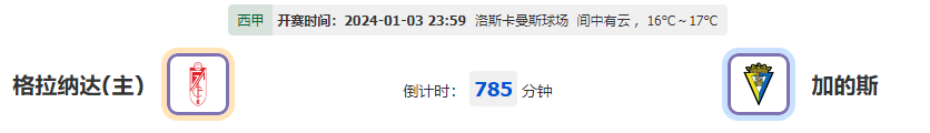 北京时间01月03日23时59分,西甲2023-2024赛季第19轮比赛,格拉纳达vs加的斯,主队现时遭遇连败士气几乎跌落至谷底,本次主场迎战同样深陷下游的加的斯,能否顺利捍卫主场继续抢分抢胜?让我们拭目以待!