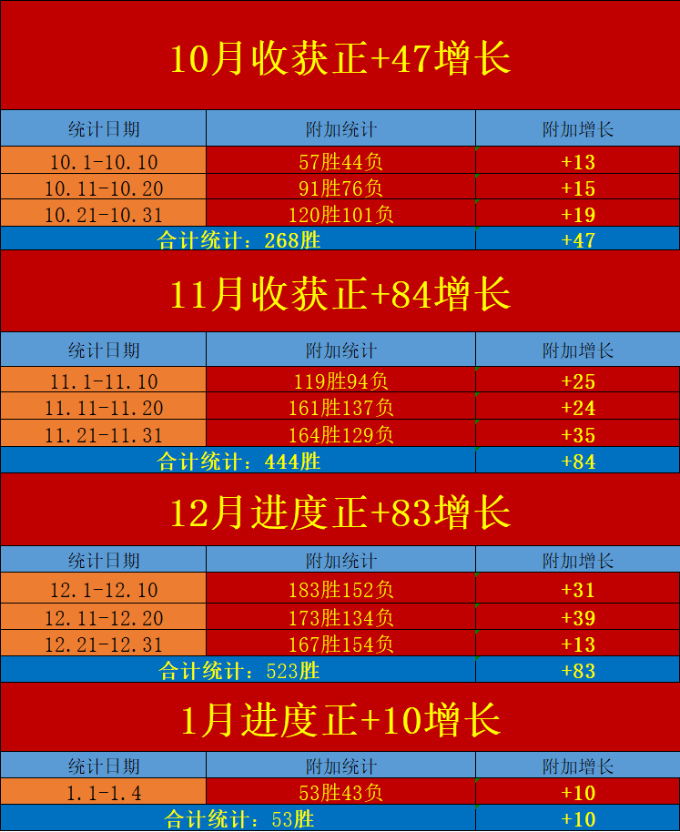 昨日整体拿下8场胜利,数据前进脚步再一次受到微弱冲击,但整体的旬计划发挥依然保持在稳定的表现轨道,10月至今拿下连续9个胜利的旬计划,笔者的目标依然是接下来的1月上旬计划优秀,在过去的9个旬计划里,笔者合计拿下了净+214场的正向增长成绩,目前的1月上旬计划也继续保持在正向的增长区间,迅速对落后板块进行微弱的数据调整,重新向优质的增长计划进行冲击!
