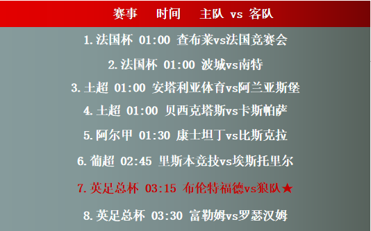 赛事前瞻:本文提供01月06日01时00分-03时30分时段的8场足球赛事走势分析表,当中包括法国杯、土超、阿尔甲、葡超等赛事提供分析参考,具备较高的参考价值。主要关注赛程如下: