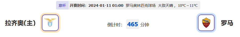 北京时间2024年1月11日01时00分,意杯2023-2024半准决赛,拉齐奥vs罗马,前面两张四强门票已经顺利决出,赛季排名接近的两队谁能得到胜利女神的青睐拿下剩余的四强门票?让我们一起期待!