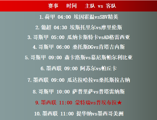 赛事前瞻:本文提供01月14日04时00分-11时00分时段的10场足球赛事走势分析表,当中包括荷甲、葡超、哥斯甲、墨西联等赛事提供分析参考,具备较高的参考价值。主要关注赛程如下: