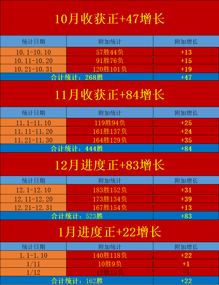 昨日已完成赛程表现中规中矩,拿下12场胜利观点分享,截至到目前为止,1月赛程进度合计拿下162场胜利观点并转化出净+22的稳定正向增长,在保持高产的同时维持着稳定的优秀正向!