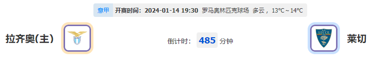 北京时间2023年01月14日19:30,此役是拉齐奥与莱切历史的第四场对决,拉齐奥目前夺取连胜摆脱颓势,此役能否拿下胜绩捍卫主场?而莱切失去此前抢分的状态,此番客访定然不失抢分战意,他们又能否做到反客为主?