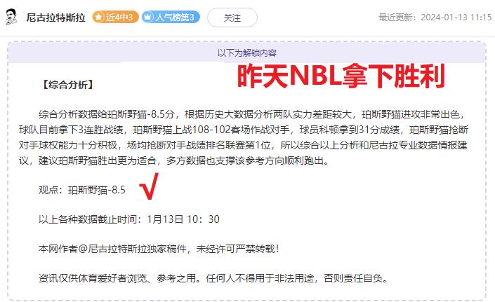 近期拿下5胜3成绩,昨NBL再拿下胜利,信心情报分析再次来袭,长期解读惊喜不断,精准赛事再出击,3月份尼古拉拿下9连胜辉煌战绩还是历历在目,2月10连胜再次顺利跑出,赛事精彩敬请留意!此前作者创下3次双位数胜战绩,掌握着一手赛事资深情报,本期继续分享充满奇妙体育赛事,敬请大家持续关注!!