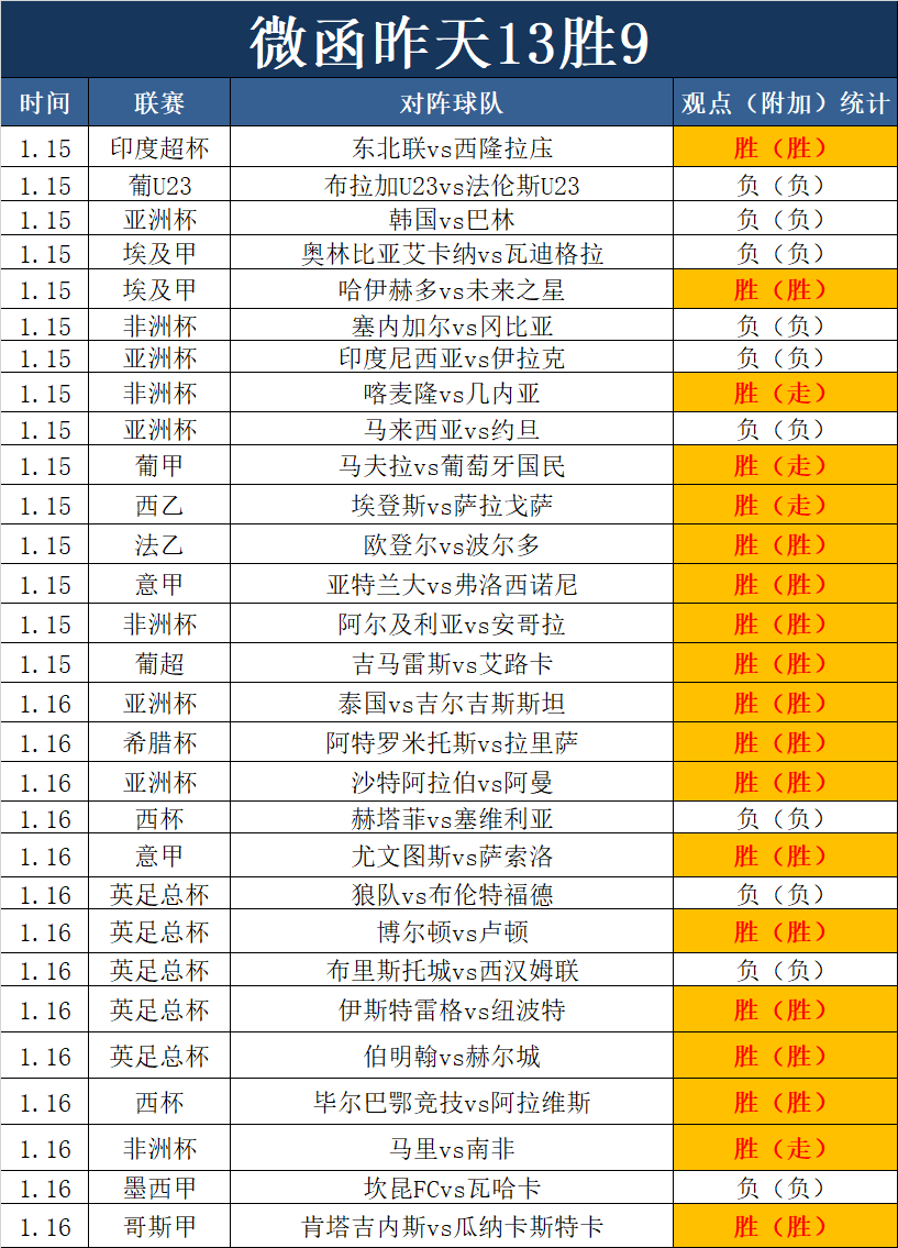 1、昨天再次狂胜,取下13胜9的成绩,有1场延迟,1场打平,昨天14场观点仅仅4场失手,狂胜节奏开始了。