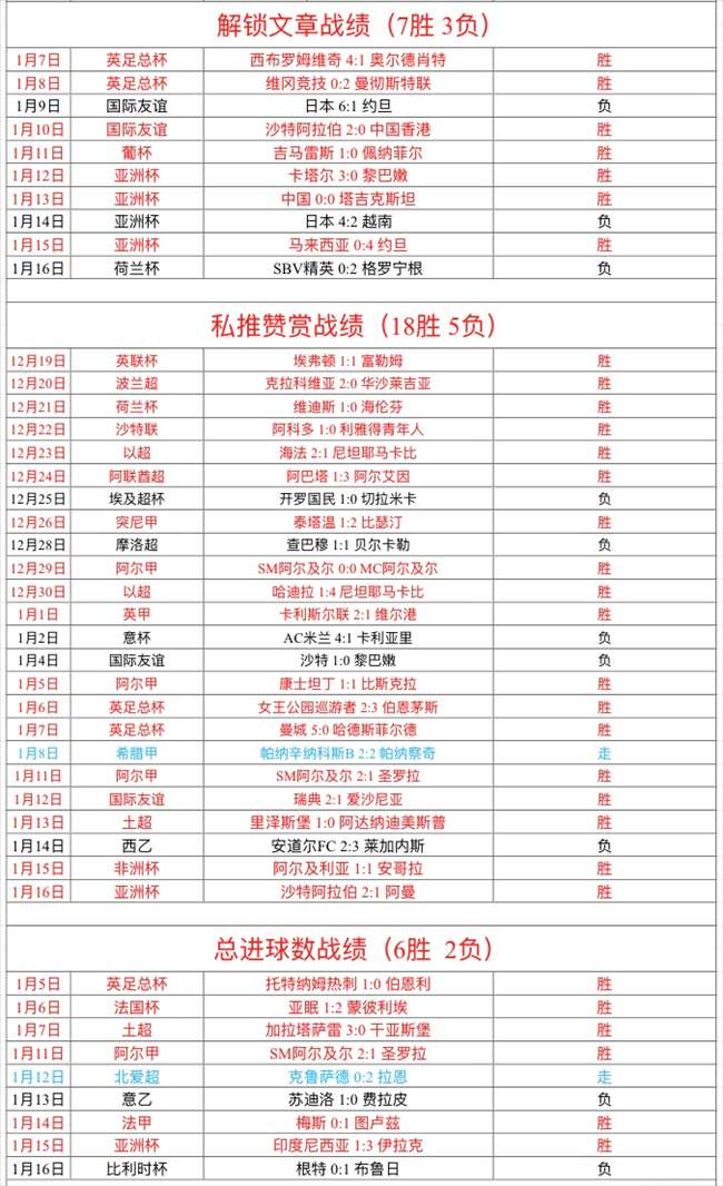 周二私推赞赏1场,沙特完美全胜拿下,私推赞赏近18胜5负,状态非常强势!解锁文章1场没有打出,近7胜3负,状态稳定!私推总进球数1场没有打出,近6胜2负!