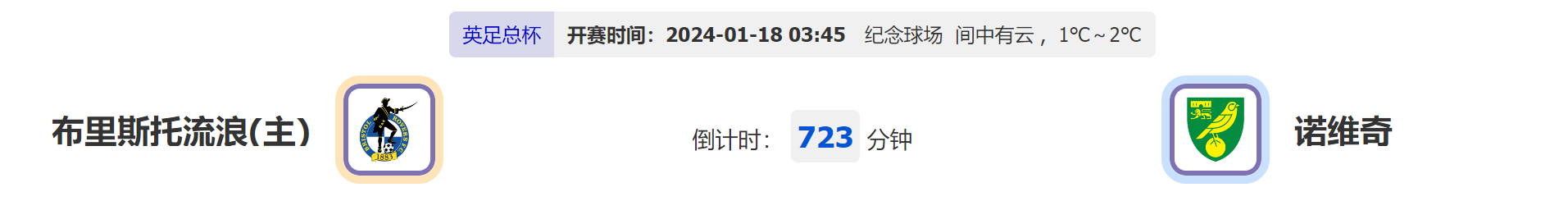 北京时间01月18日03:45,2023-2024 英格兰足总杯赛,布里斯托流浪vs诺维奇,两队在各自联赛都是排在中游位置,今天比赛两队英足总杯相遇会有怎样态度?
