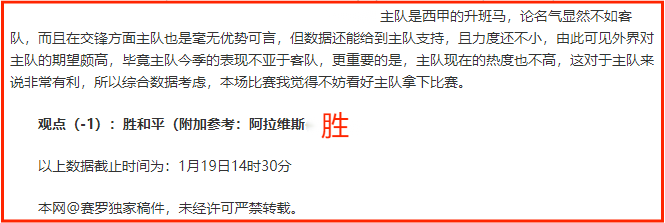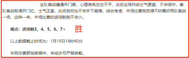 (温馨提示:观点回顾为已完场赛事的统计,并不能代表未来的观点预测结果走势,观点仅为其个人意见,与平.台无关。资讯仅供体育爱好者浏览,并不构成购.彩建议,任何人不得用于非法用途,请广大用户理性消费。)
