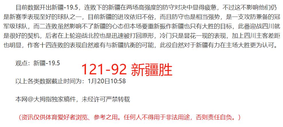 昨日为大家分享的CBA赛事新疆vs四川,新疆凭借着出色的防守表现顺利大胜四川,新疆方向顺利取胜,本人近期CBA成绩13胜9。以下为大家分享一场CBA赛事吉林vs青岛,敬请期待!