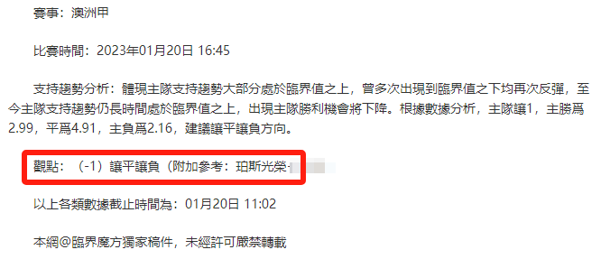 溫馨提示:觀點回顧為已完場賽事的統計,並不能代表未來的觀點預測結果走勢,觀點僅為其個人意見,與本網站無關。資訊僅供體育愛好者瀏覽,並不構成購.彩建議,任何人不得用於非法用途,請廣大用戶理性消費。