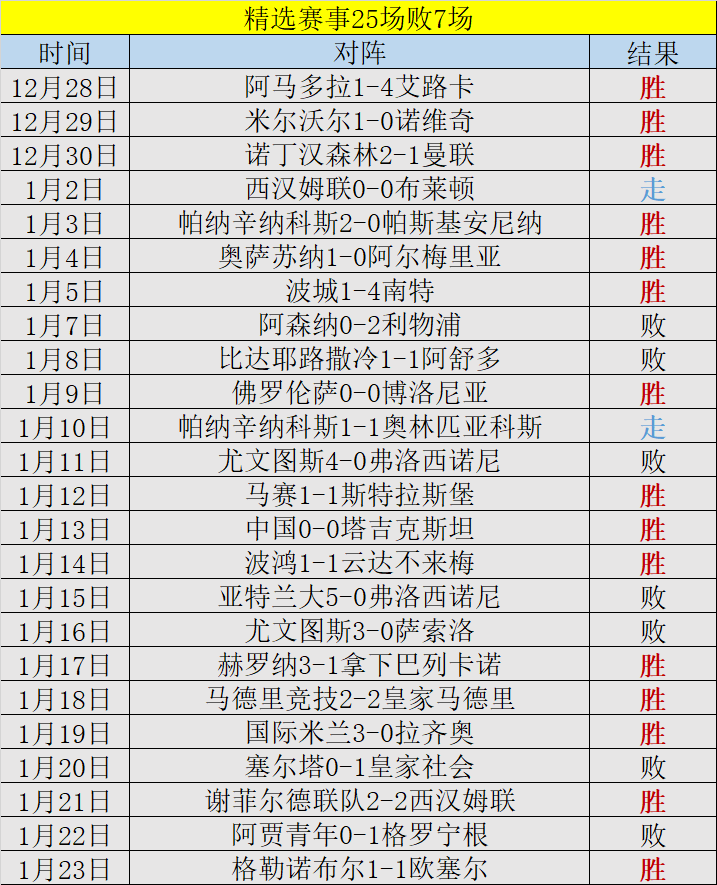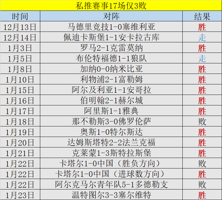 私推赛事17场仅3败、精选赛事25场败7场。今晚继续努力,争取延续好成绩。