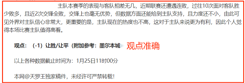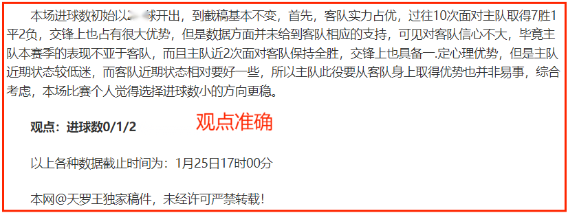 (温馨提示:观点回顾为已完场赛事的统计,并不能代表未来的观点预测结果走势,观点仅为其个人意见,与平.台无关。资讯仅供体育爱好者浏览,并不构成购.彩建议,任何人不得用于非法用途,请广大用户理性消费。)