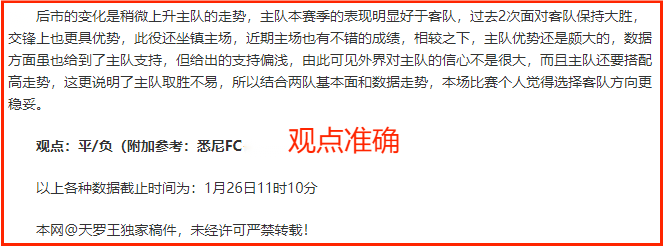 (温馨提示:观点回顾为已完场赛事的统计,并不能代表未来的观点预测结果走势,观点仅为其个人意见,与平.台无关。资讯仅供体育爱好者浏览,并不构成购.彩建议,任何人不得用于非法用途,请广大用户理性消费。)