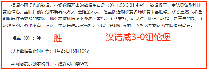 (温馨提示:观点回顾为已完场赛事的统计,并不能代表未来的观点预测结果走势,观点仅为其个人意见,与平.台无关。资讯仅供体育爱好者浏览,并不构成购.彩建议,任何人不得用于非法用途,请广大用户理性消费。)