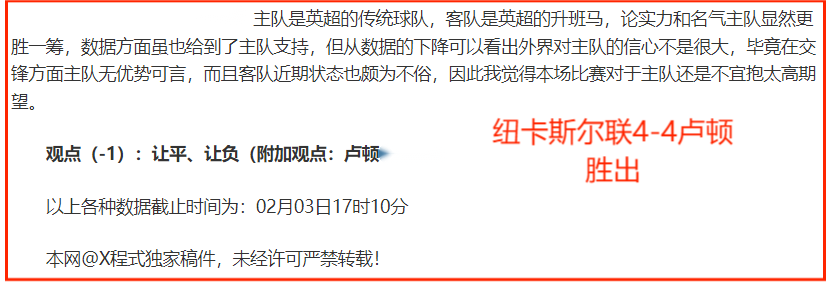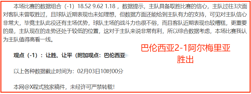 (温馨提示:观点回顾为已完场赛事的统计,并不能代表未来的观点预测结果走势,观点仅为其个人意见,与平.台无关。资讯仅供体育爱好者浏览,并不构成购.彩建议,任何人不得用于非法用途,请广大用户理性消费。)