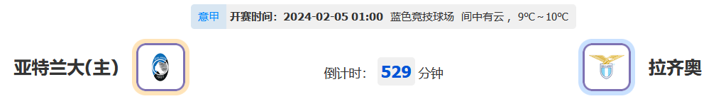 北京时间2024年2月05日01:00,意甲联赛2023-2024赛季第23轮比赛,亚特兰大vs拉齐奥,本场对赛的两队在联赛实际分差只有2分,本场比赛是关系到欧战区价值6分的大战,谁能拿下这场关键的胜利带笑离场?让我们一起拭目以待!