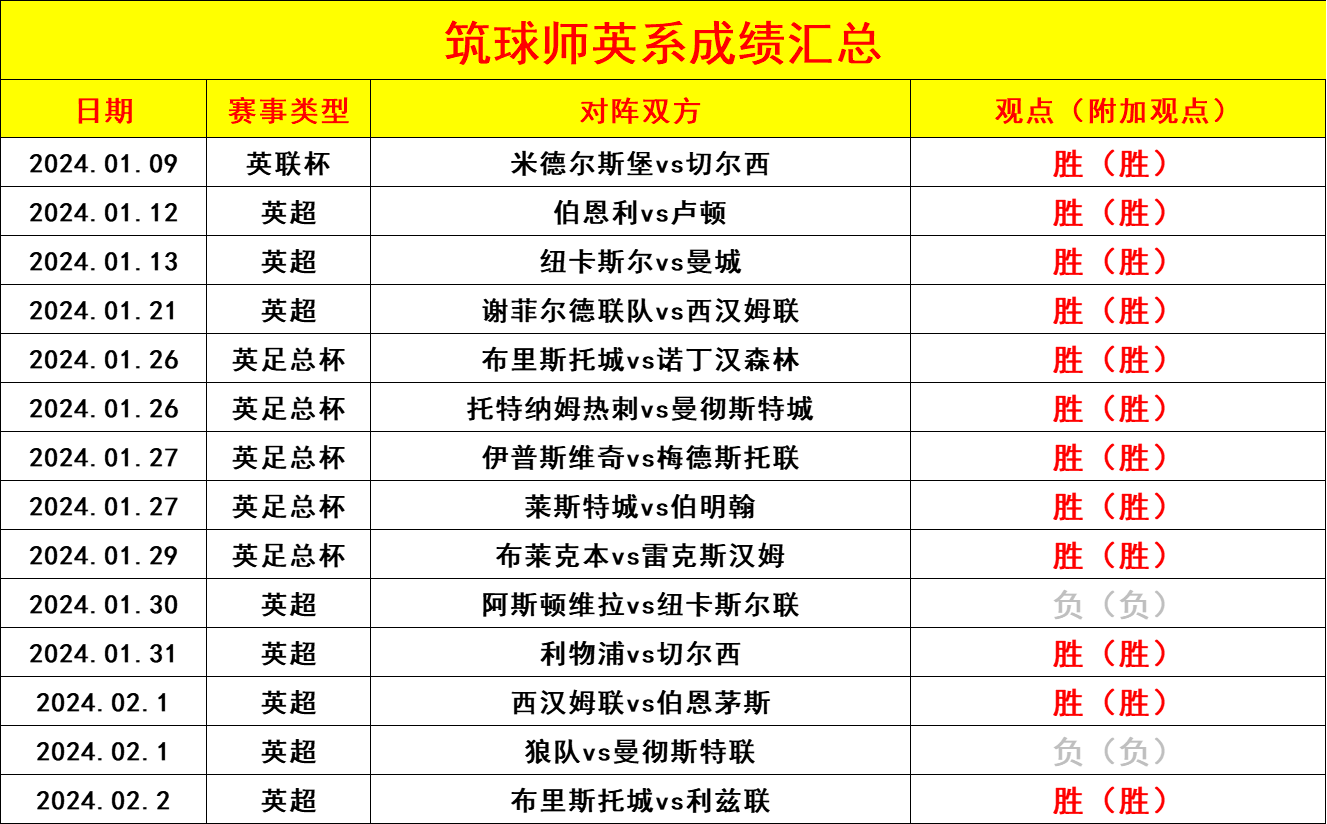 上一场继续送出擅长的英超比赛:布里斯托城vs利兹联,参考利兹联方向,没任意外,利兹联1-0拿下比赛;英系比赛一直都是笔者的强项,近14场英系的比赛,取得14胜12的优异成绩,胜率高达86%;今天周末同样有英超的比赛,笔者会继续深耕比赛来比送给大家;希望大伙们可以一起与筑球师研究胜利的观点。
